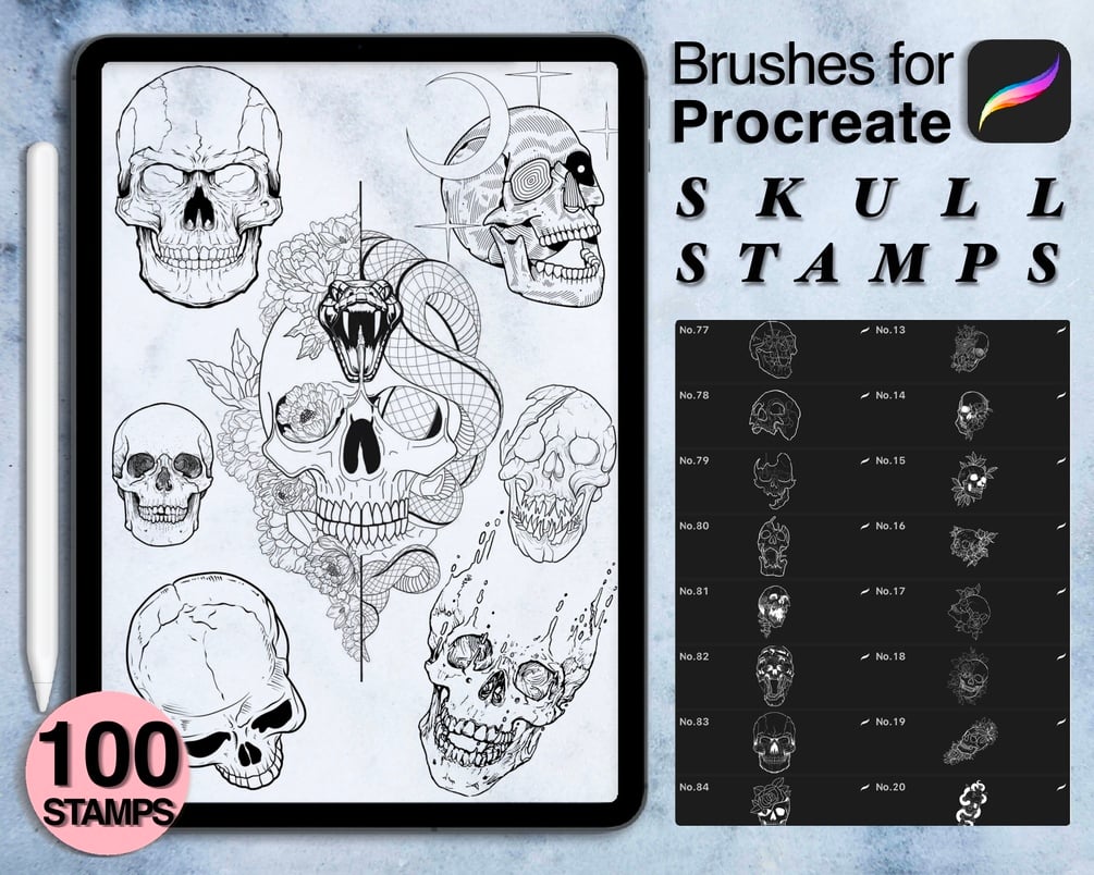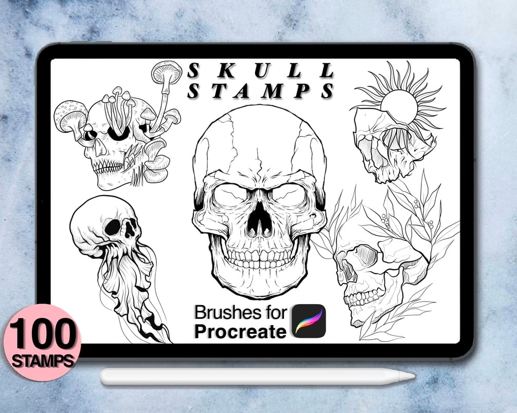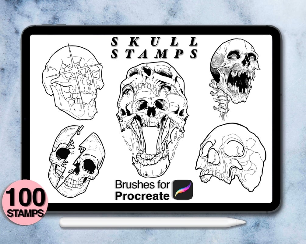 100 procreate skull stamps | procreate brushes | black work tattoo style